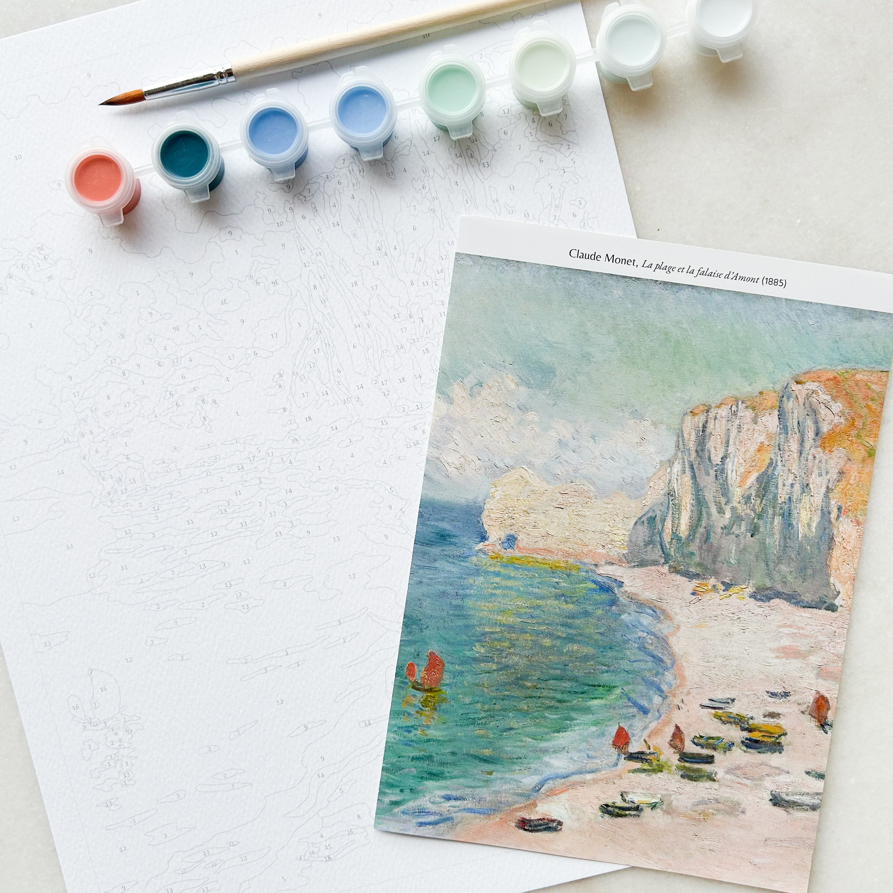 Ce coffret contient tout le nécessaire pour réaliser le tableau La plage et la falaise d'Amont de Claude Monet .