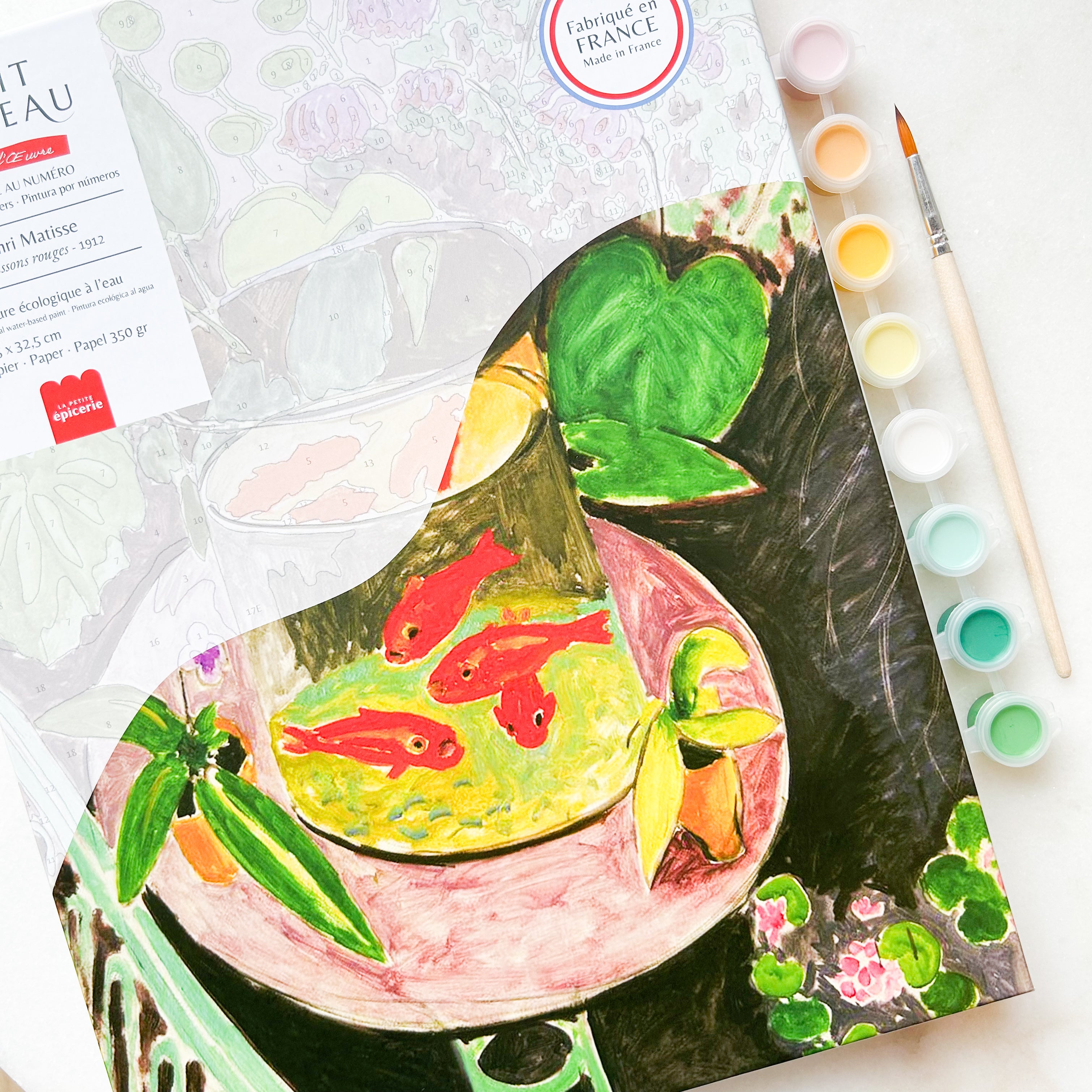 Ce coffret contient tout le nécessaire pour réaliser le tableau Les poissons rouges d'Henri Matisse .